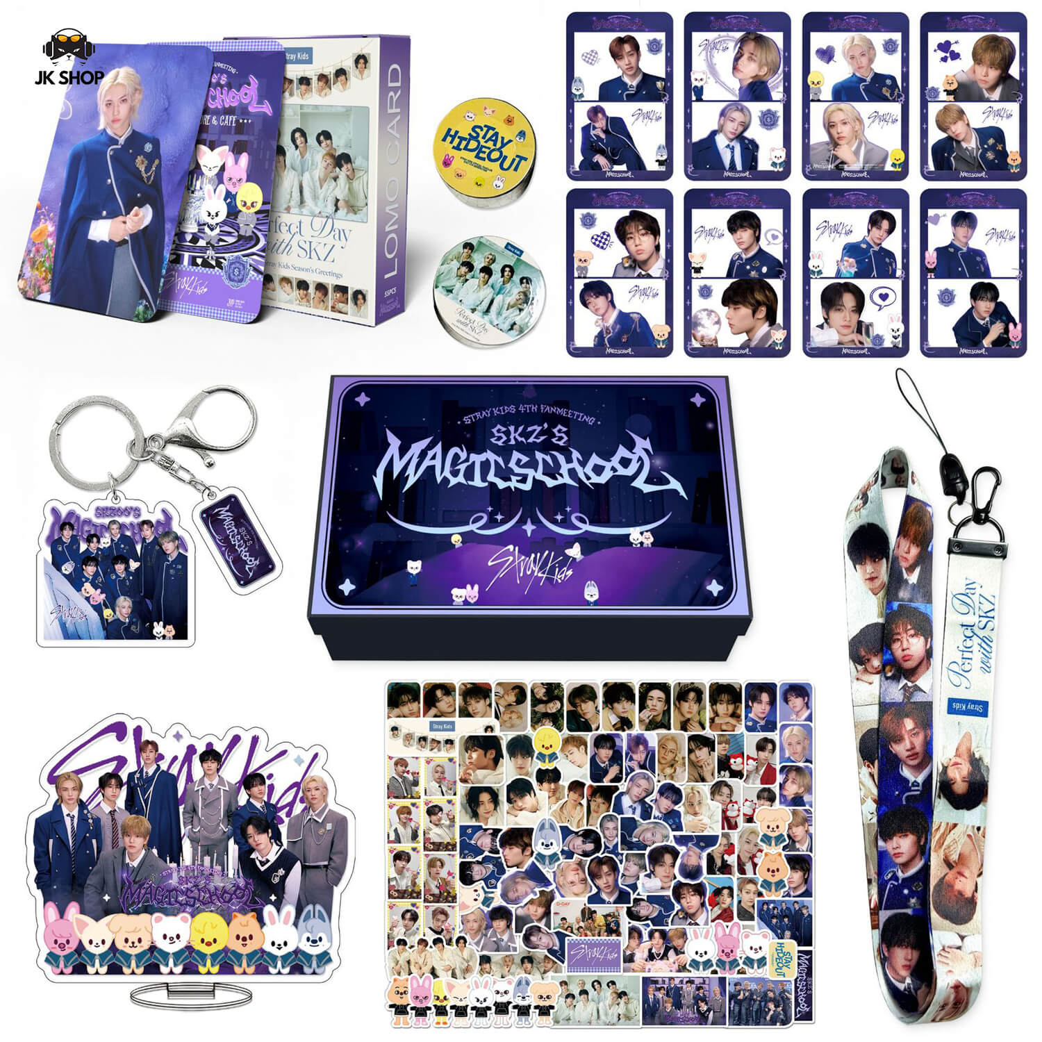The gift box contains: an acrylic keychain, an acrylic stand, 2 rolls of accounting tape, a lanyard, a set of instagram transparent cards (8 pieces), one pack of lomo cards (55 pieces), a set of stickers (88 pieces), a total of 8 items.